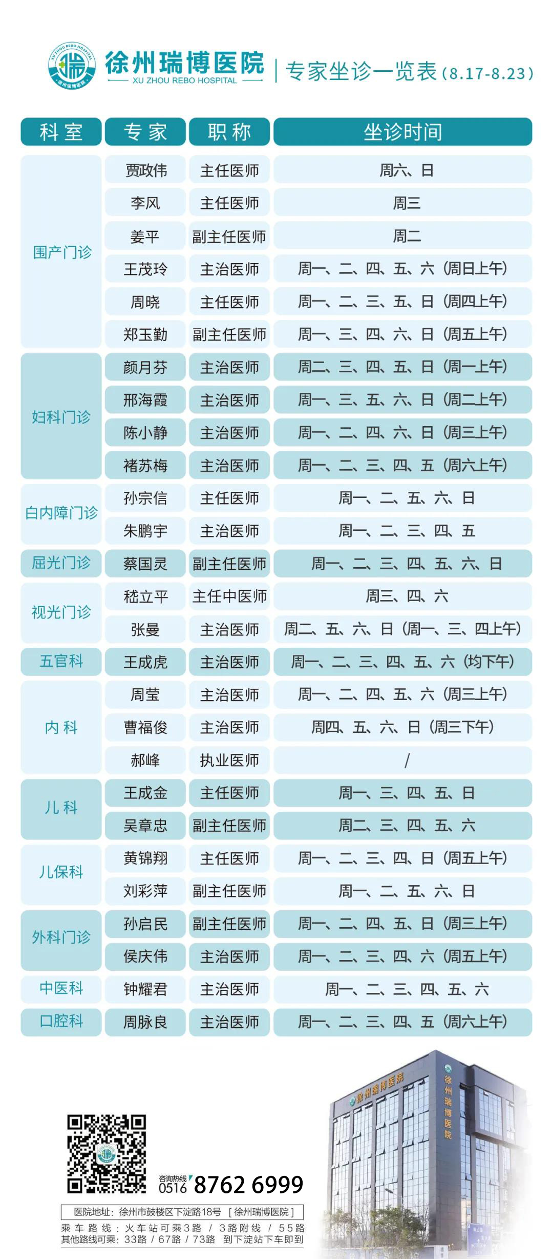 瑞博医院2020年8月17日-8月23日专家坐诊时间表,请