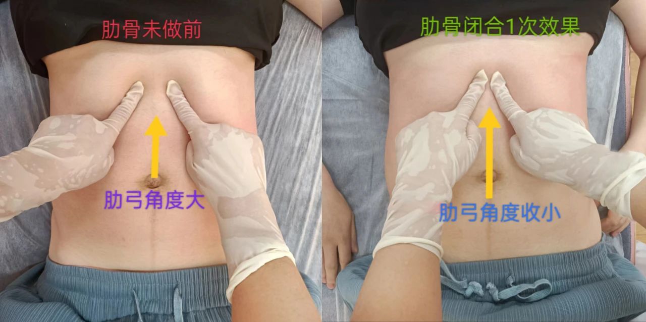 在经过产康师一次闭合手法矫正后,肖女士的肋弓角度明显变小,效果显著。